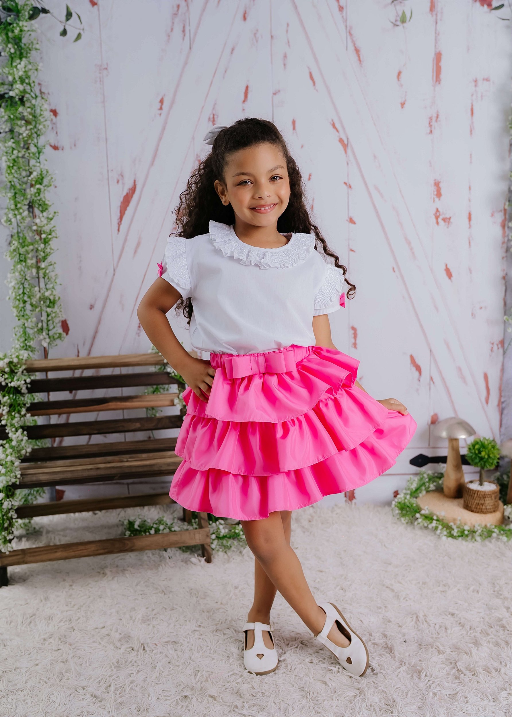 Conjunto Infantil Saia Tafeta e Camisa Branca Pink